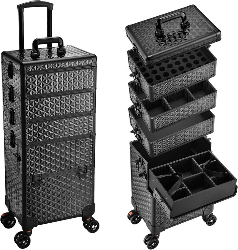 Yaheetech Valise Maquillage à roulettes 4 en 1 Cadre Aluminium Mallette Mauillage Professionnelle Bijoux Cosmétique NoirMultifonction 4 en 1 : Cette valise maquillage à roulettes est composée de 4 parties détachables : un coffret en haut portatif, deux boîtes au milieu, une grande boîte inférieure, utilisées individuellement ou en combinaison Gain de place : Cette valise esthétique se rélève compacte, grâce à une taille de 34 cm L x 25,5 cm l x 80,5 cm H. Vous pouvez retirer les roulettes amovibles selon les besoins Large stockage : Vos objets de toutes formes et tailles seront bien organisées dans cette grande valise de maquillage. De petite taille comme rouge à lèvre ou de grande taille comme sèche-cheveux. Une solution efficace de stockage Designs soigneux : Les bords et les coins sont tous renforcés par métal solide mais lisse, permettant à la fois une structure solide et une bonne expérience d’utilisation. On se concentre sur les petits détails, en adoptant la quincaillerie performante Adapté aux voyageurs : Sur 4 roulettes pivotantes à 360°, notre valise maquillage professionnelle se dépalce de manière fluide et silencieuse. La poignée rétractable facilite le transport des affaires, permettant une bonne stabilité